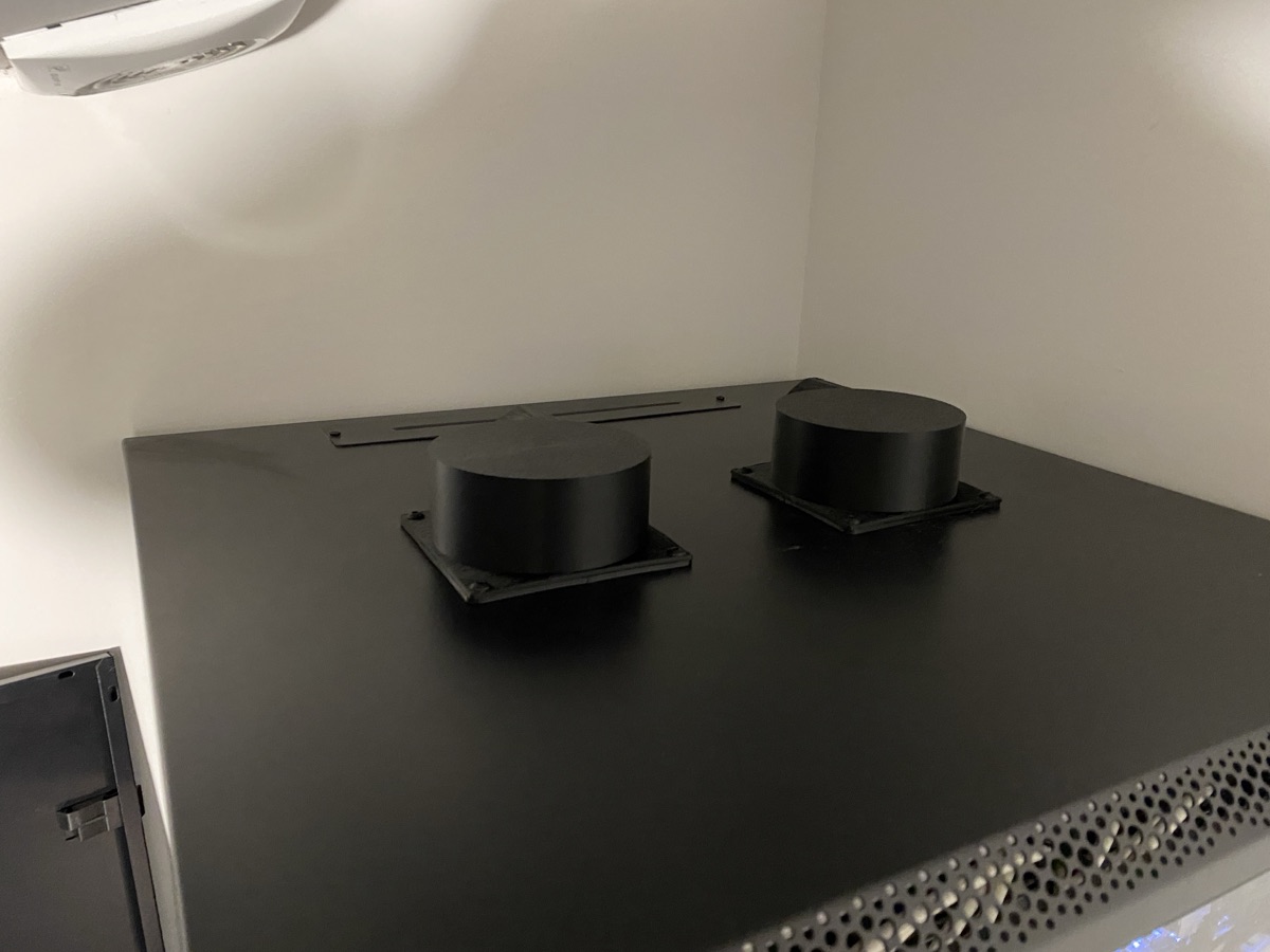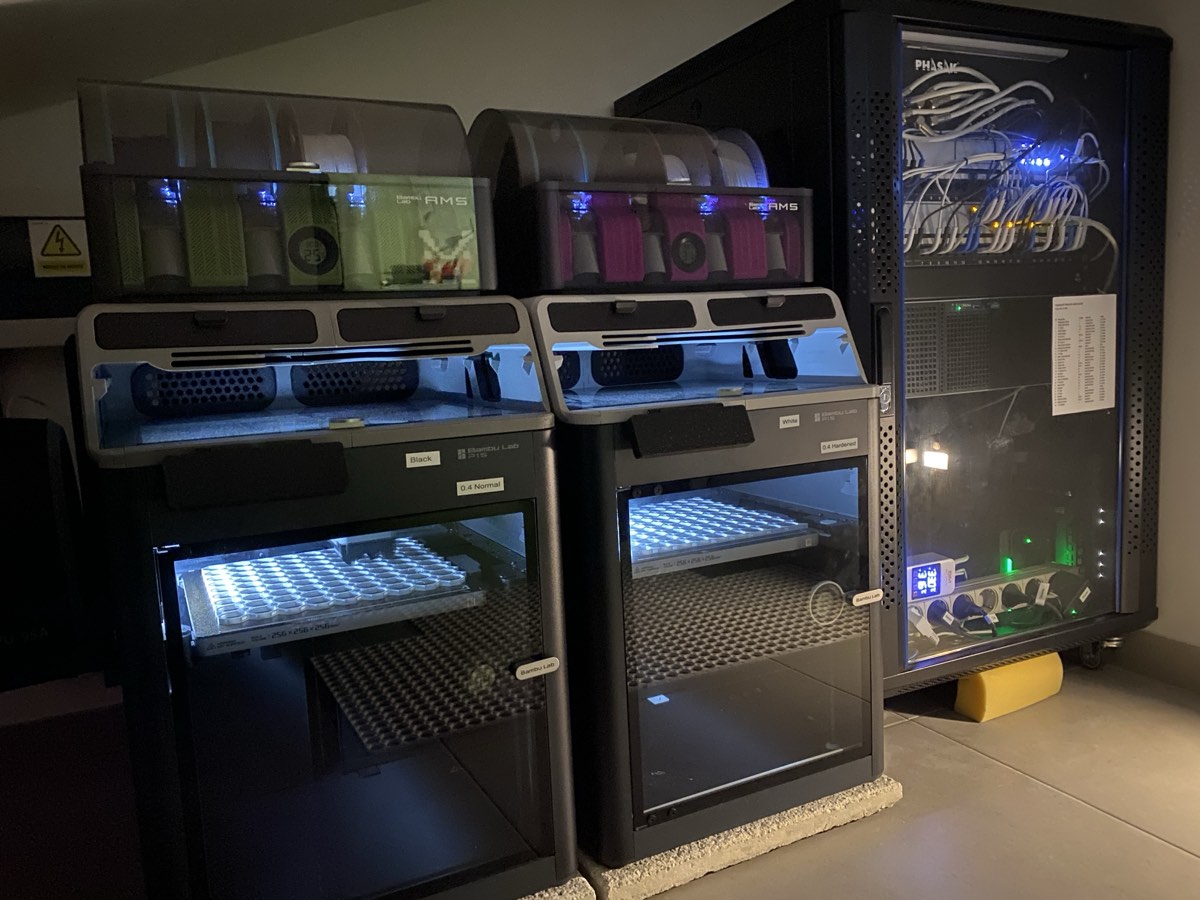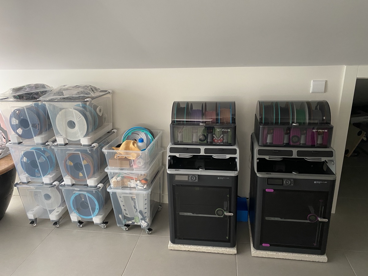 The two P1S printers were originally sitting in the open, next to the filament storage. It worked, but the noise during long prints was annoying and there was no way to manage fumes — ruling out more abrasive materials like ASA or ABS.