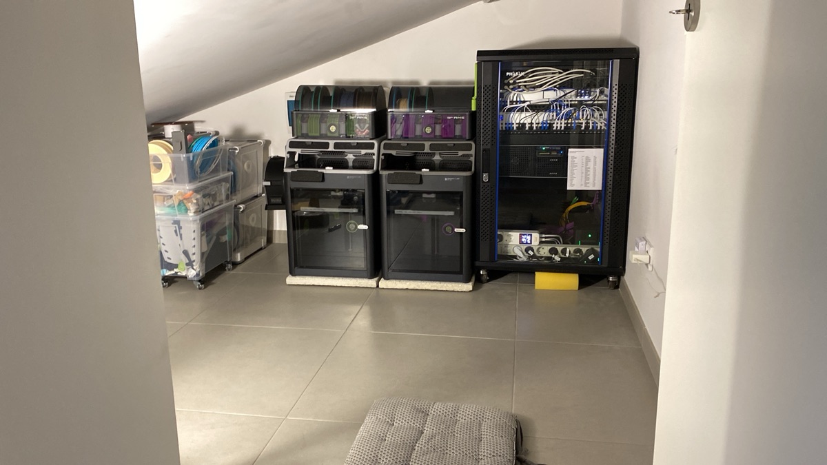 The solution was to move them into the room where the server rack already lives. It’s a space that can be closed off with a door, keeping noise and heat contained. It also opens the path for proper air extraction — something both the printers and the server rack will benefit from.