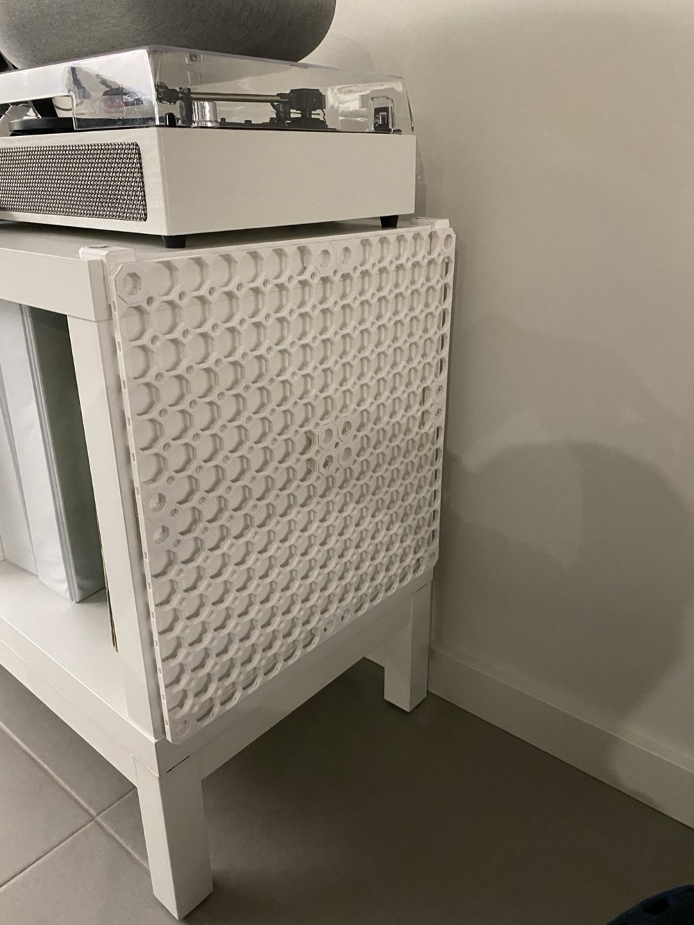 The key was finding a mounting solution that doesn’t damage the furniture. The Kallax connector for Multiboard clips onto the Kallax frame without screws or adhesive, making it fully reversible.