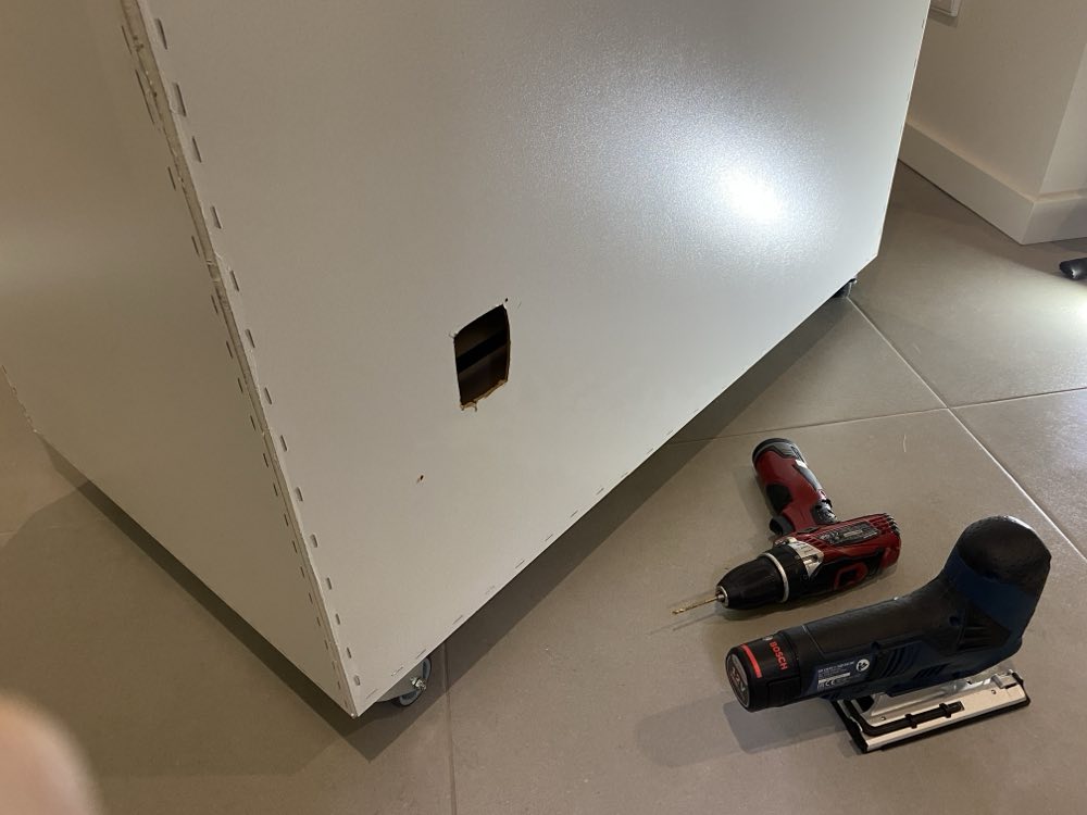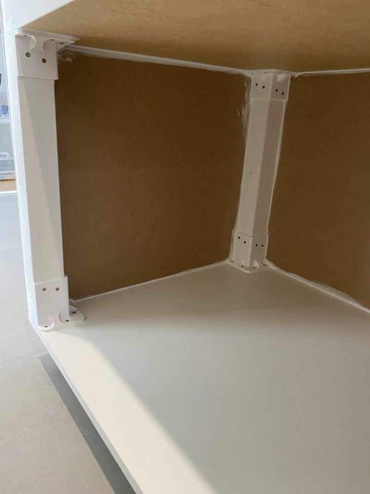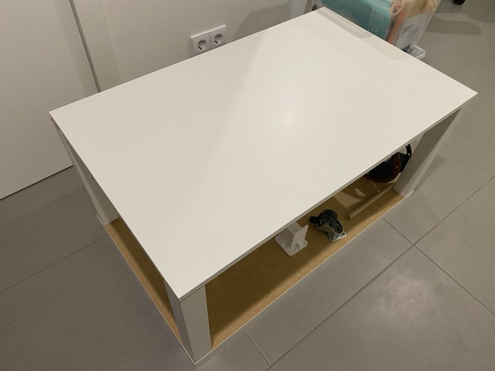 The Lack table was raised using 3D printed sturdy leg extenders, and I made a zero-height version of the same bracket for the opposite side to keep both ends consistent in appearance. Locking caster wheels were added underneath for easy mobility. The whole enclosure was sealed with silicone to keep moisture from creeping in through gaps.