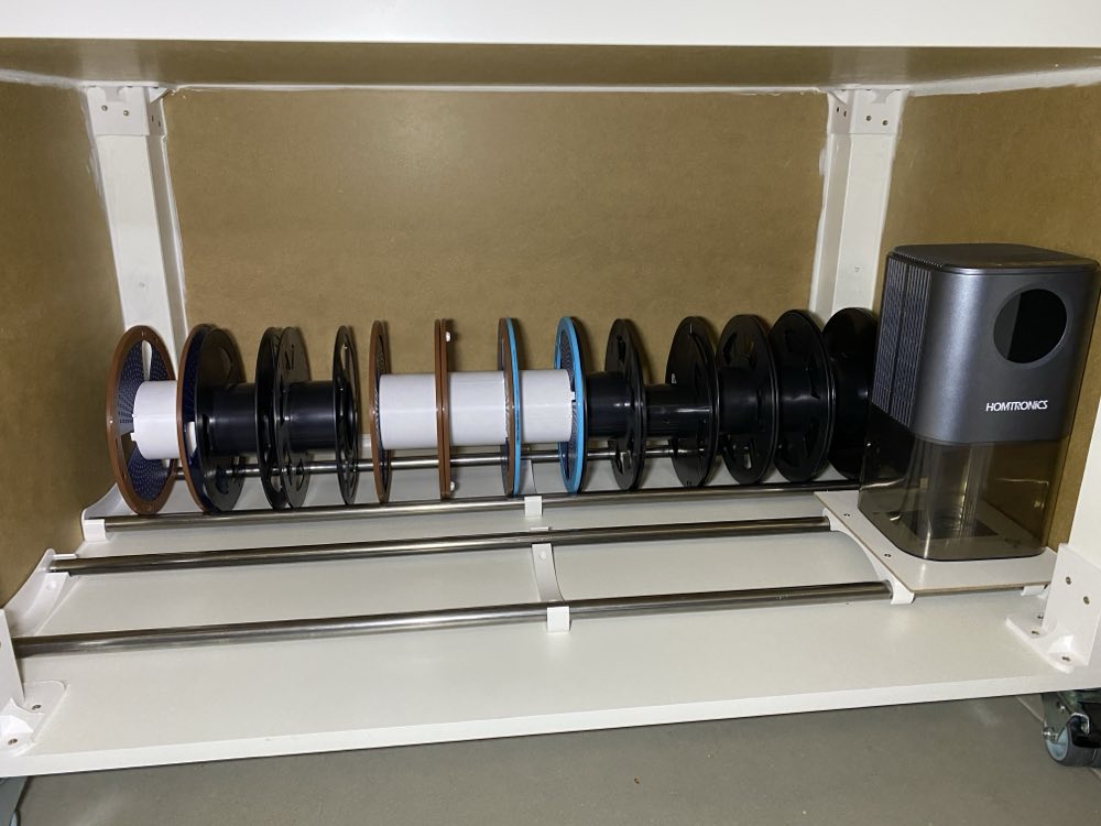 The spools sit on stainless steel tubes acting as rails, held in place by 3D printed spool holders. A second layer of rails above may be added in the future for additional capacity.