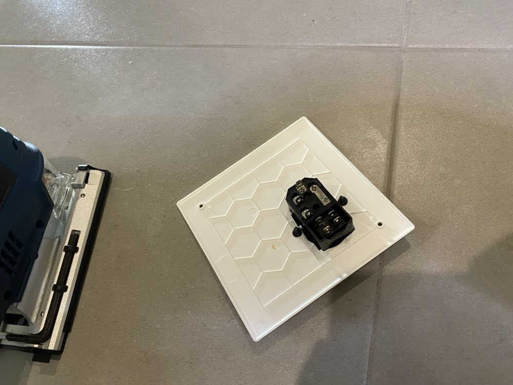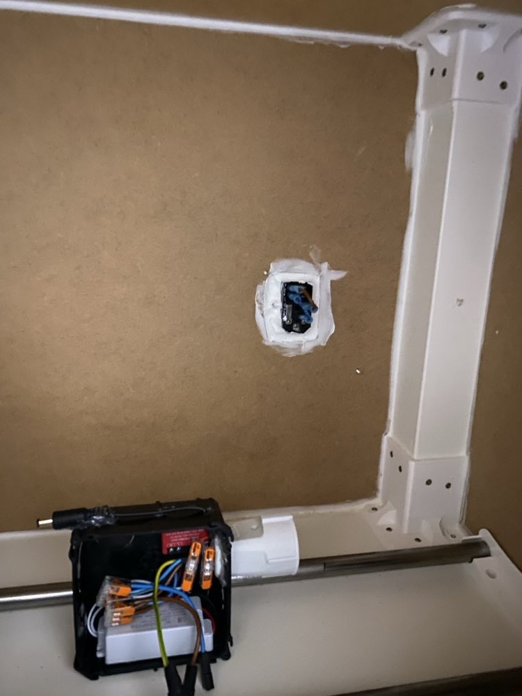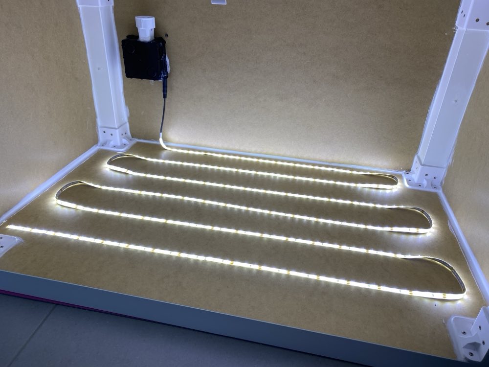 An IEC 320 C14 inlet was cut into the back panel to bring mains power inside the box. LED strip lights were laid across the top in a serpentine pattern, providing visibility when picking spools. A Shelly 1PM Gen3 wired with Wago 221 connectors controls the LED lights remotely.