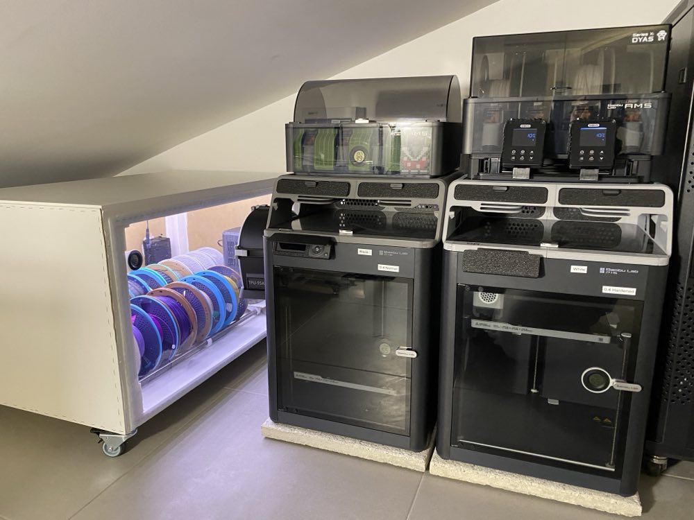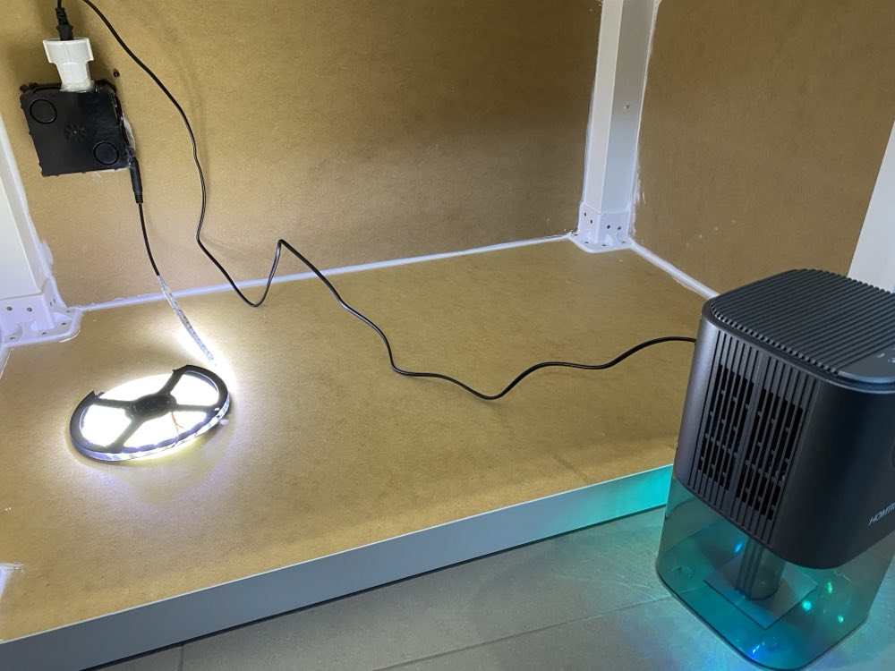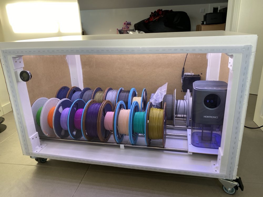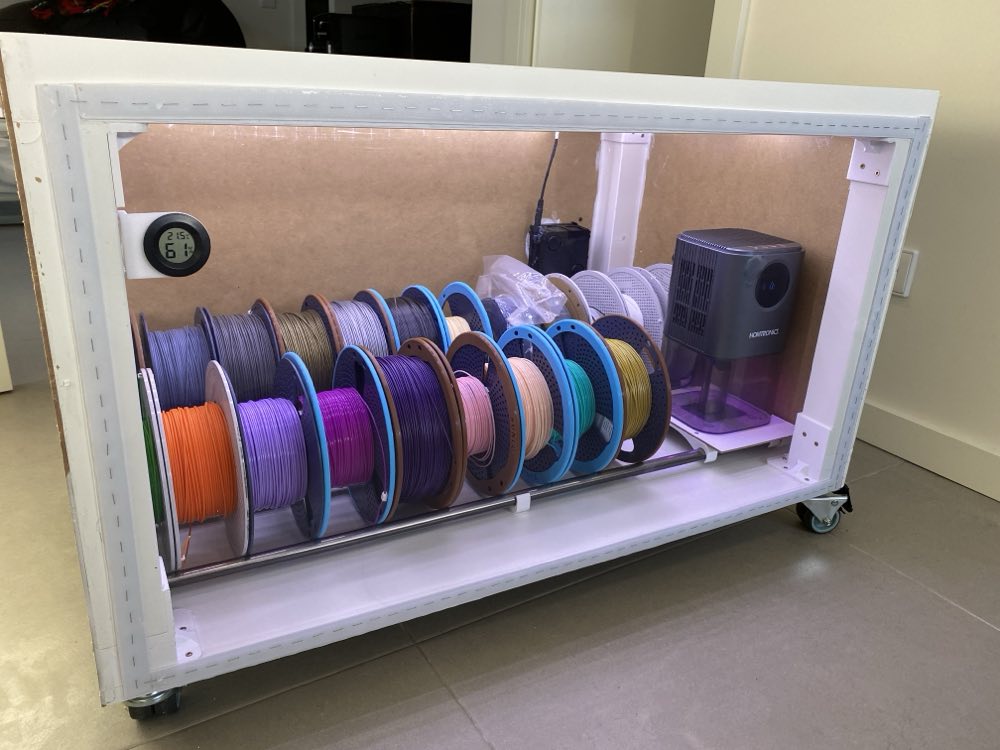 The humidity has been sitting at a steady 36% for several days now. Whether that’s the floor for this dehumidifier or the velcro door not sealing well enough is hard to say and will require some research — but either way, it’s a significant improvement over silica gel since it requires zero maintenance and I’m able to get all spools in the same place.